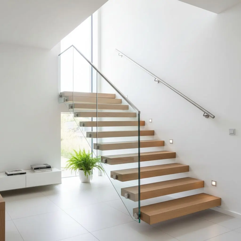 - Schody dywanowe — najlepiej wyglądają z balustradami całoszklanymi, które podkreślają ich unikalną formę.