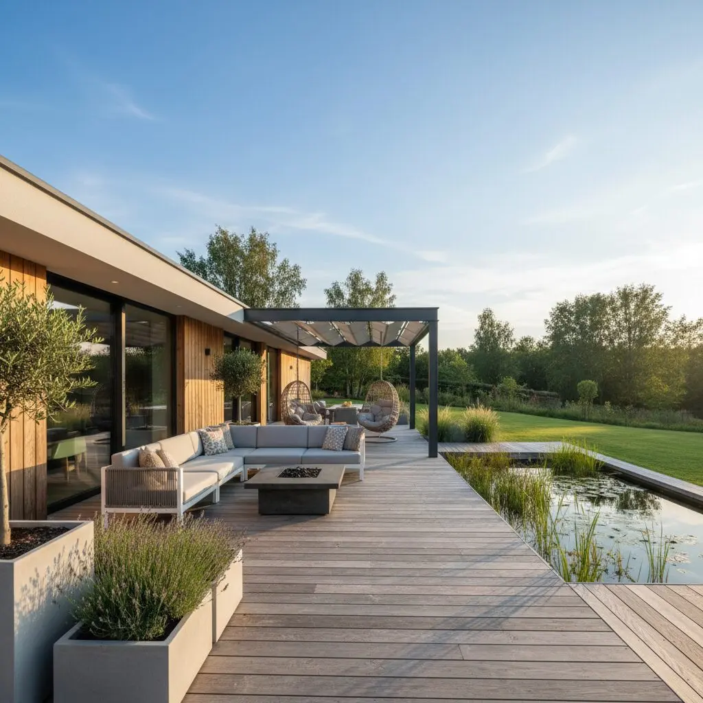 - Pergola lub markiza — chroni przed słońcem i definiuje przestrzeń „salonu pod chmurką”.