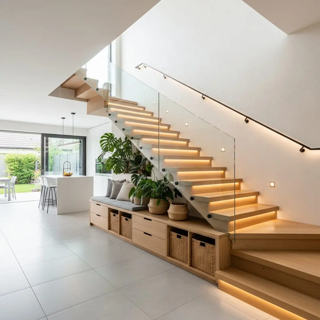 - Taśmy LED ukryte pod noskami stopni dla efektu „lewitujących” schodów.