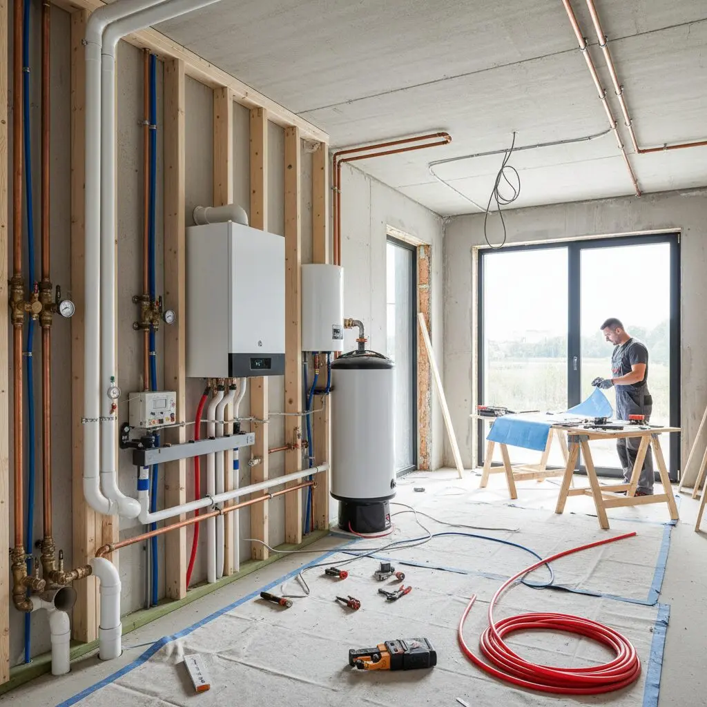 Poza samym urządzeniem grzewczym, musisz doliczyć koszt zasobnika na wodę użytkową (ok. 3000 — 5000 zł), grup pompowych, naczyń przeponowych oraz robocizny za tzw. uzbrojenie kotłowni. Profesjonalny hydraulik w nowym domu poświęca na ten etap około 3 — 5 dni roboczych, co generuje koszt samej usługi na poziomie 4000 — 7000 zł.