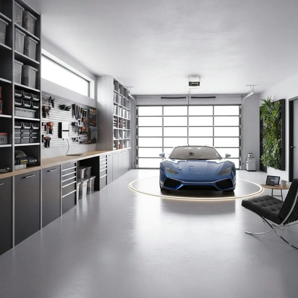 W nowoczesnym garażu stosuje się trzy rodzaje oświetlenia: ogólne, robocze oraz dekoracyjne (akcentujące). Odpowiednie światło nie tylko ułatwia parkowanie, ale też eksponuje sylwetkę samochodu, tworząc klimat premium.