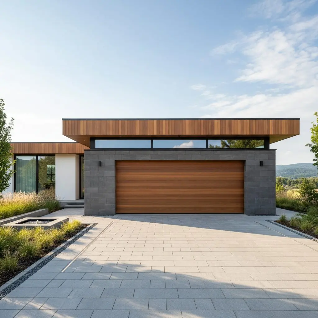Nowoczesna elewacja garażu wyróżnia się zastosowaniem naturalnych materiałów, takich jak drewno, kamień lub beton architektoniczny, połączonych z gładkim tynkiem w odcieniach szarości lub bieli. Charakterystyczne są również ukryte rynny oraz minimalistyczne oświetlenie LED wbudowane w podbitkę lub ściany. Odpowiednio dobrana elewacja sprawia, że garaż przestaje być tylko budynkiem gospodarczym, a staje się wizytówką posesji.