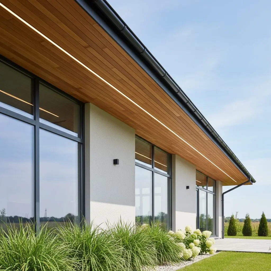 Nowoczesne trendy — podbitka w kolorze drewna na dachu bezokapowym?