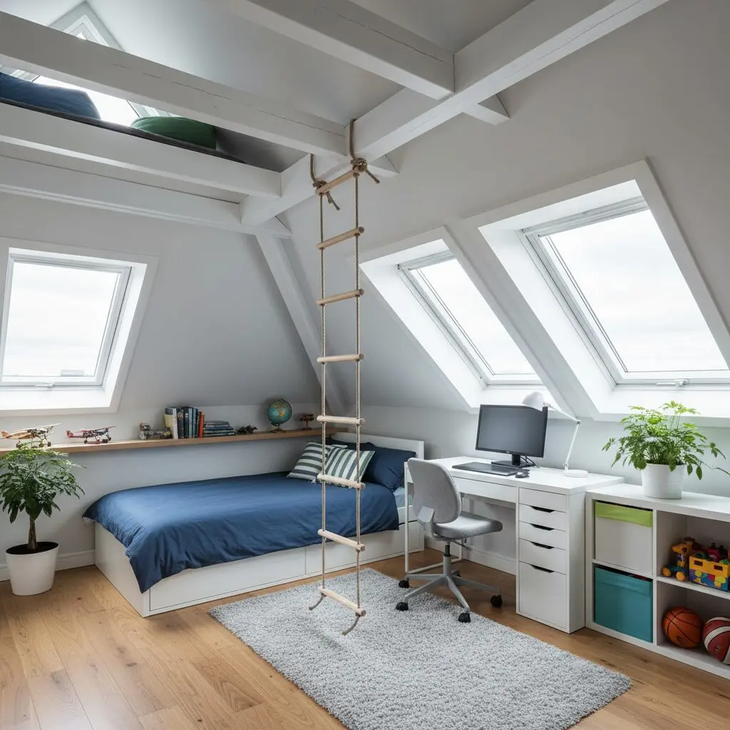 Wybierając meble do nauki, warto rozważyć biurko z regulowaną wysokością blatu. Ponieważ pokój dla chłopca na poddaszu często ma ograniczoną przestrzeń na regały, dobrym pomysłem jest zamontowanie półek na książki na ścianie szczytowej, która zazwyczaj jest jedyną pełnowymiarową ścianą w pomieszczeniu.