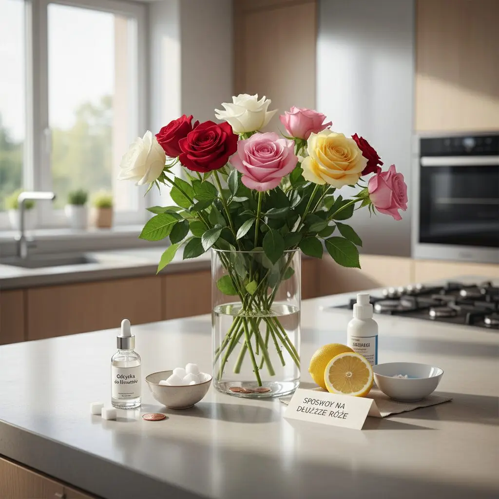 Aby róże w wazonie zachowały świeżość, należy dodać do wody substancje, które pełnią dwie funkcje: odżywczą oraz odkażającą. Najskuteczniejsze dodatki to cukier, kwas cytrynowy, aspiryna oraz specjalistyczne odżywki do kwiatów ciętych. Bakterie rozwijające się w naczyniu to najczęstszy powód, dla którego kwiaty marnieją, dlatego tak ważne jest utrzymanie higieny środowiska wodnego.