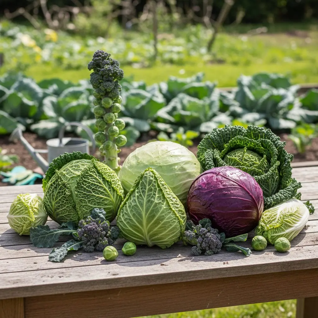 - Kapusta włoska — rozpoznawalna po pomarszczonych, ciemnozielonych liściach.