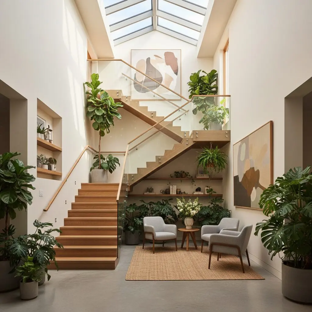 Kolory ziemi, takie jak terakota, szałwia czy piaskowy beż, wprowadzają do wysokich przestrzeni spokój i harmonię. Są one mniej męczące dla oka niż czysta biel i lepiej maskują ewentualne zabrudzenia, o które łatwo w ciągach komunikacyjnych. W połączeniu z naturalnymi roślinami doniczkowymi na spocznikach, kolory te tworzą kojącą aurę, która wita domowników po wejściu na piętro.
