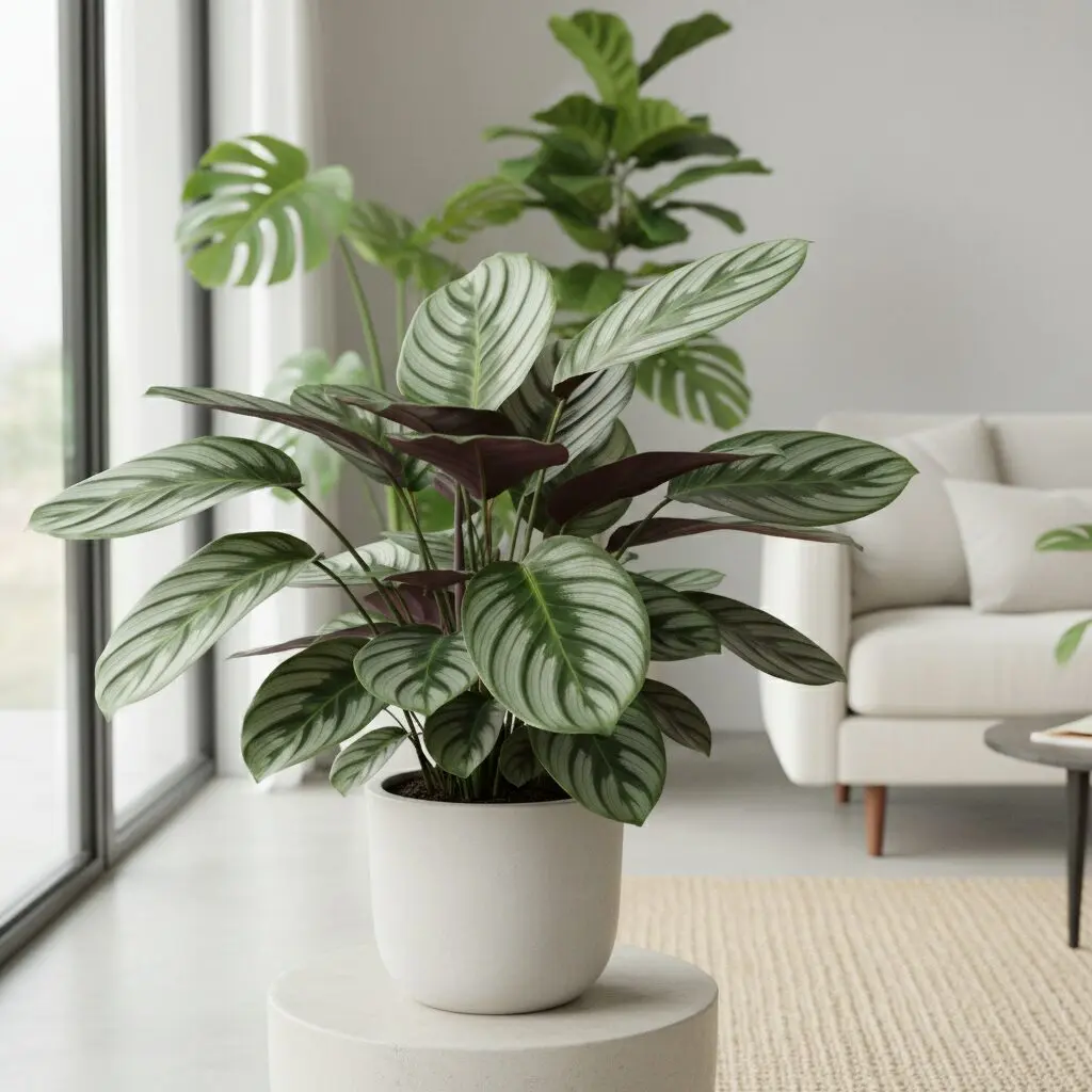 Calathea medallion to jedna z najbardziej rozpoznawalnych odmian, ceniona za swoje duże, niemal idealnie okrągłe liście. Ich wierzch zdobi skomplikowany wzór odcieni zieleni i srebra, który wygląda jak ręcznie malowany medalion, natomiast spód liścia zachwyca głębokim, purpurowym kolorem. Wymaga podobnych warunków co orbifolia, jednak jest nieco bardziej tolerancyjna na błędy w podlewaniu, choć nadal nienawidzi przesuszenia.