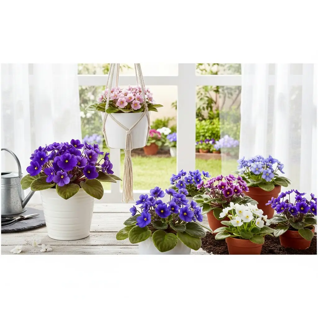 - Fiołek afrykański (Sępolia) — najpopularniejszy wybór do wnętrz, kwitnie niemal cały rok w różnych kolorach.