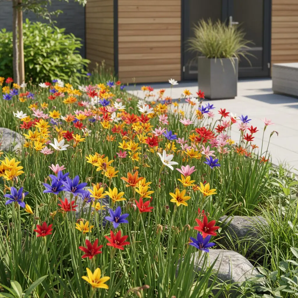 Aby uzyskać efekt barwnego dywanu, warto sadzić cebulki w grupach po 15-20 sztuk. Iksja ma wąski, trawiasty pokrój, więc pojedyncze egzemplarze mogą „zginąć” wśród innych roślin. Najlepsze efekty wizualne uzyskasz, sadząc cebulki w nieregularnych kępach, co nadaje rabacie naturalny, łąkowy charakter. Warto mieszać różne odmiany kolorystyczne, tworząc multikolorowe kompozycje, które przyciągają wzrok z daleka.