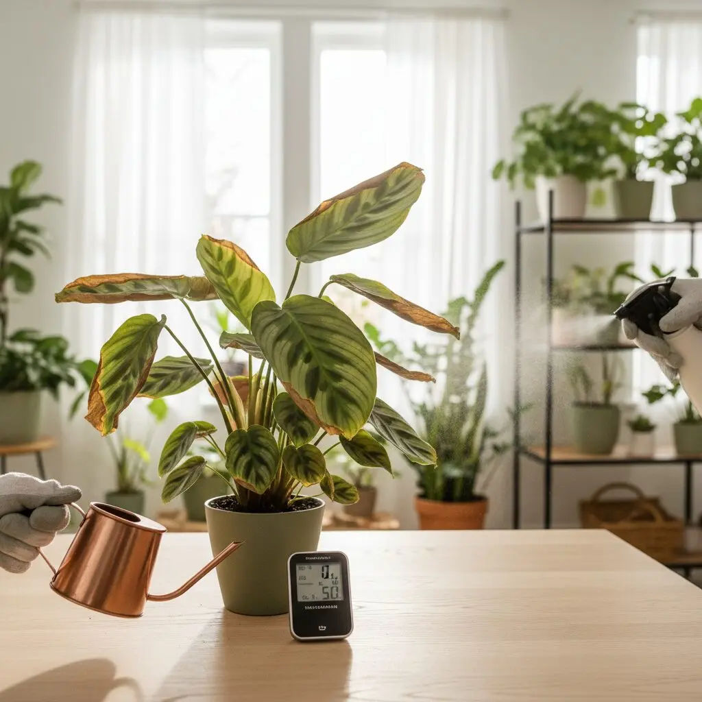 Jeśli zauważysz, że końcówki liści Twojej kalatei stają się suche i papierowe, prawdopodobnie wilgotność w pomieszczeniu spadła poniżej 50—60%. W przeciwieństwie do sukulentów, kalatea nie magazynuje wody na zapas i transpiruje ją bardzo szybko przez dużą powierzchnię liści. Aby temu zapobiec, warto zainwestować w nawilżacz ultradźwiękowy lub ustawić doniczkę na tacy z keramzytem i wodą. Pamiętaj, że samo zraszanie daje efekt krótkotrwały i przy twardej wodzie może pozostawiać nieestetyczne osady.