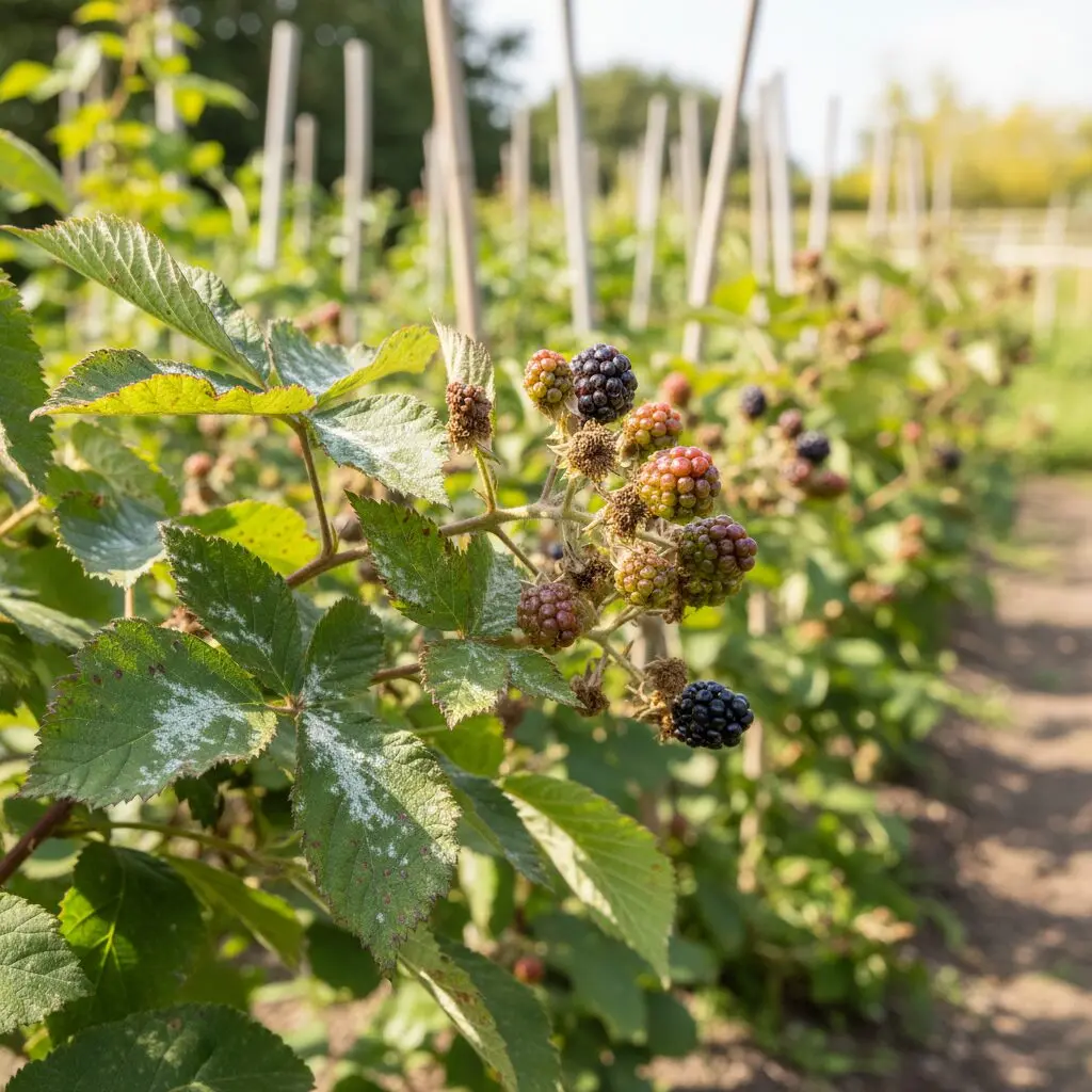 | Rdza jeżyny | Pomarańczowe pęcherze na spodzie liści. | Przedwczesne opadanie liści, osłabienie wzrostu. |