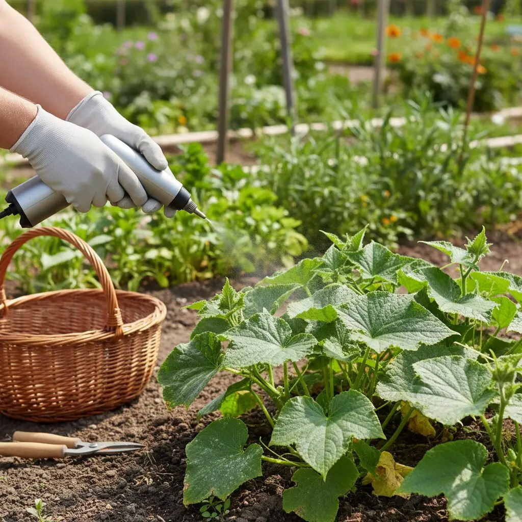 Ogórki mają szorstkie liście, które łatwo zatrzymują wilgoć, co sprzyja mączniakowi. Podczas zabiegu upewnij się, że roślina jest sucha — nigdy nie pryskaj rano, gdy na liściach zalega rosa, ponieważ rozcieńczy ona preparat i zmniejszy jego skuteczność. Stosuj dysze drobnokropliste, które zapewnią idealne pokrycie całej powierzchni rośliny.