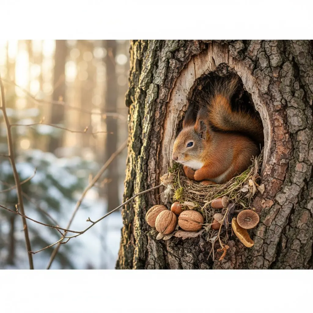 Zimą dieta wiewiórek opiera się niemal wyłącznie na tym, co udało im się zgromadzić jesienią lub co znajdą w karmnikach. Ponieważ ziemia często jest zamarznięta lub przykryta śniegiem, dostęp do świeżego pokarmu jest zerowy. Wiewiórki wykazują się niesamowitą inteligencją, ukrywając tysiące pojedynczych orzechów w różnych lokalizacjach, co minimalizuje ryzyko utraty całych zapasów na rzecz innych zwierząt.