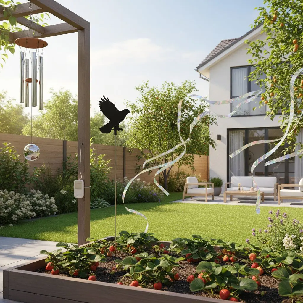 - Dziecięce wiatraczki — ich szybki ruch dezorientuje ptaki.